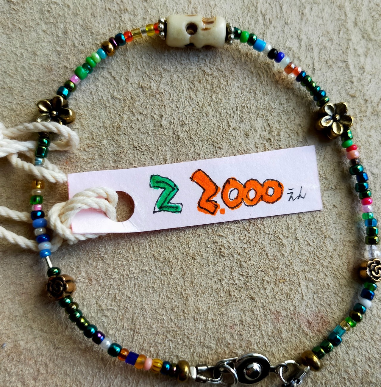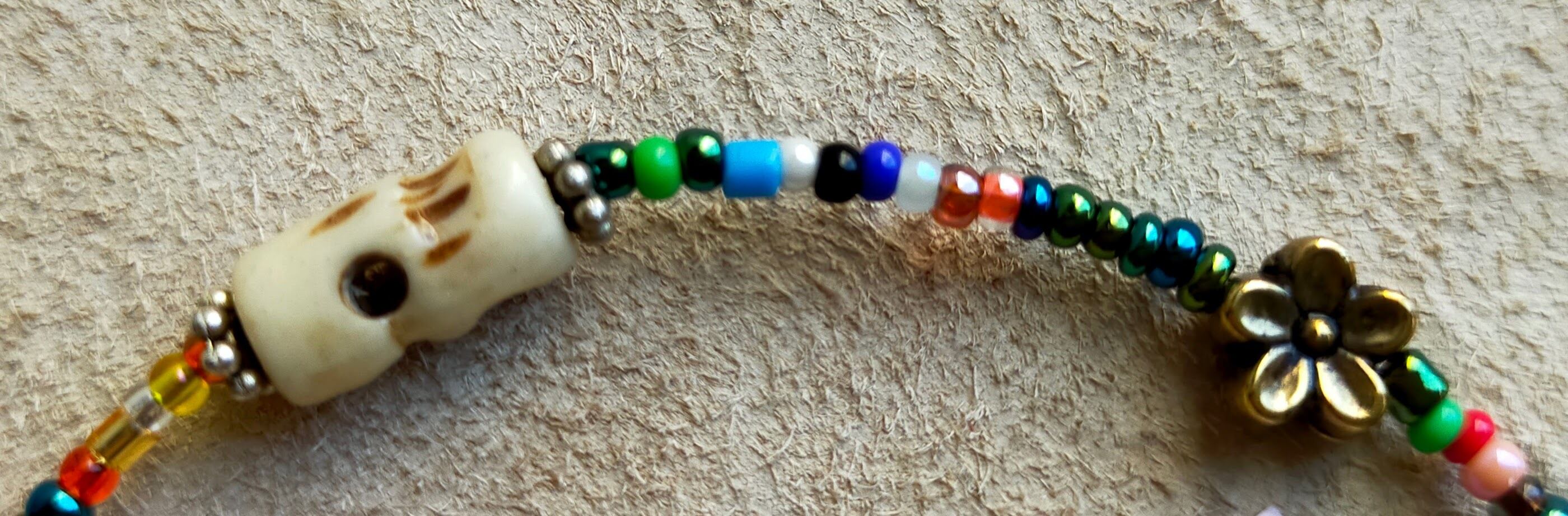 小径カラフルガラスビーズ、中央にボーンスカルメタルの花を使用している ヒッピー世代を思わせる