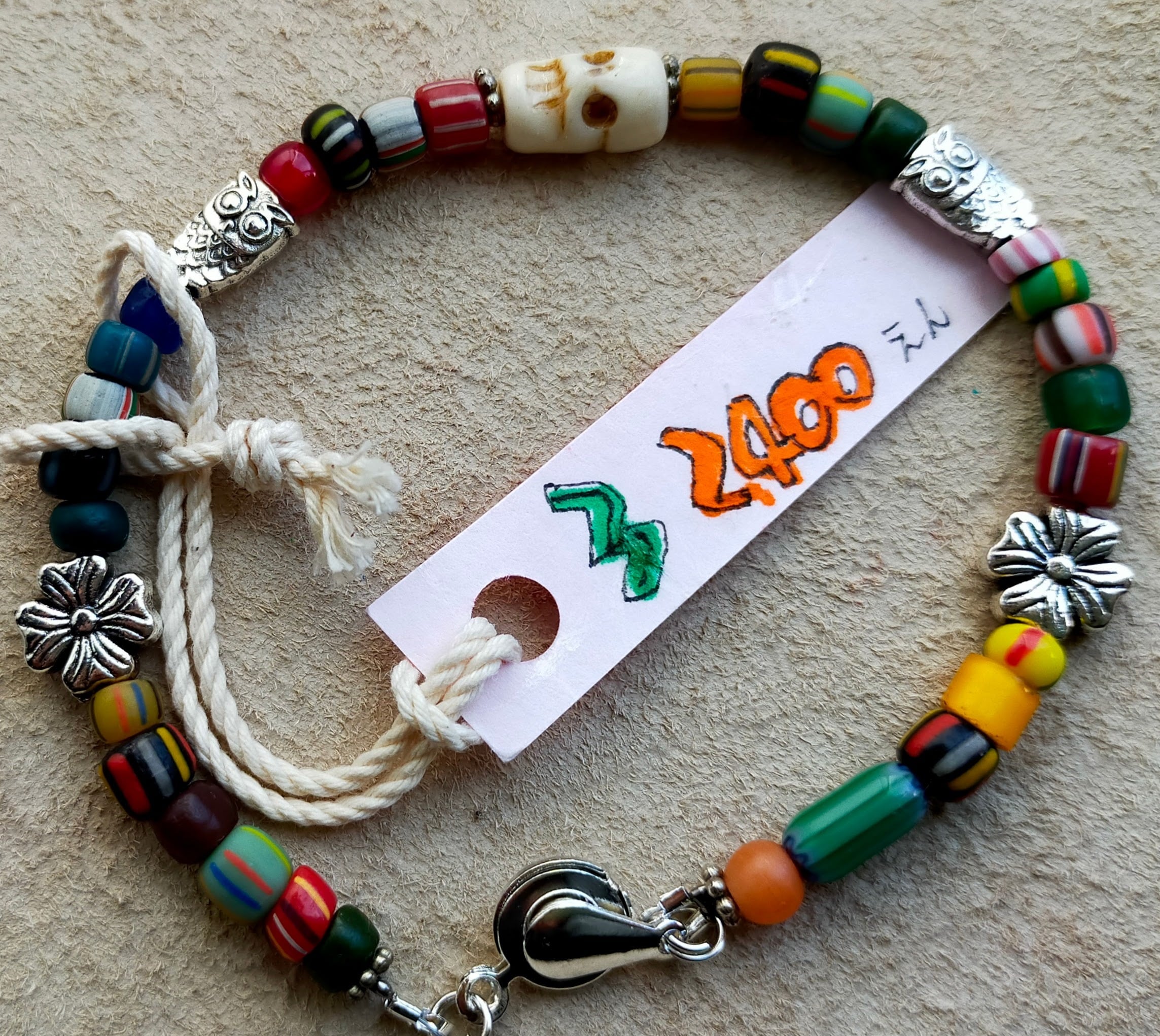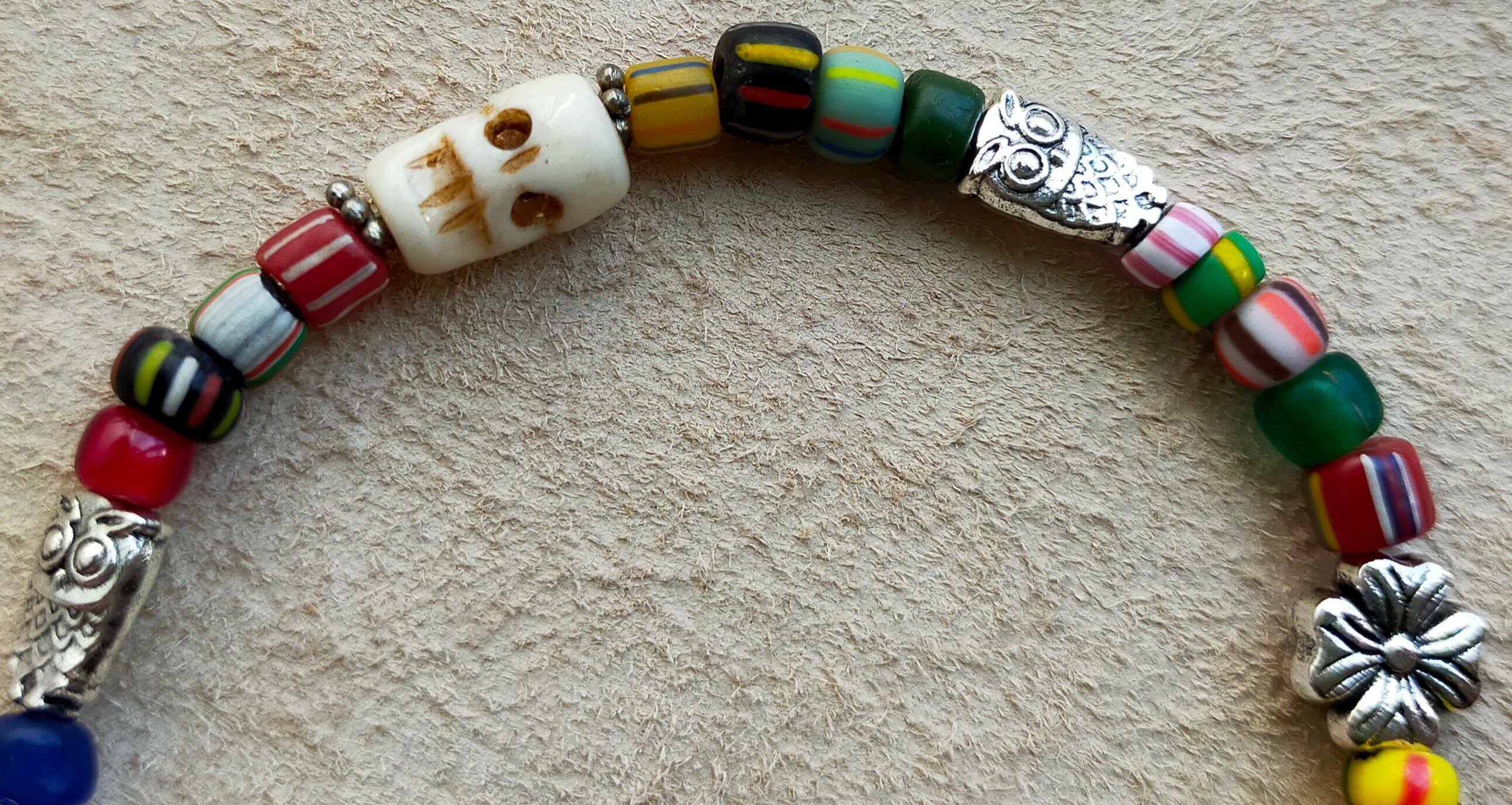 中径のカラフルジャワビーズを使用して中央にボーンスカル 又 メタルのフクロウとシルバーメタルの花を配置して魔除け他、開運幸運が期待できるお品