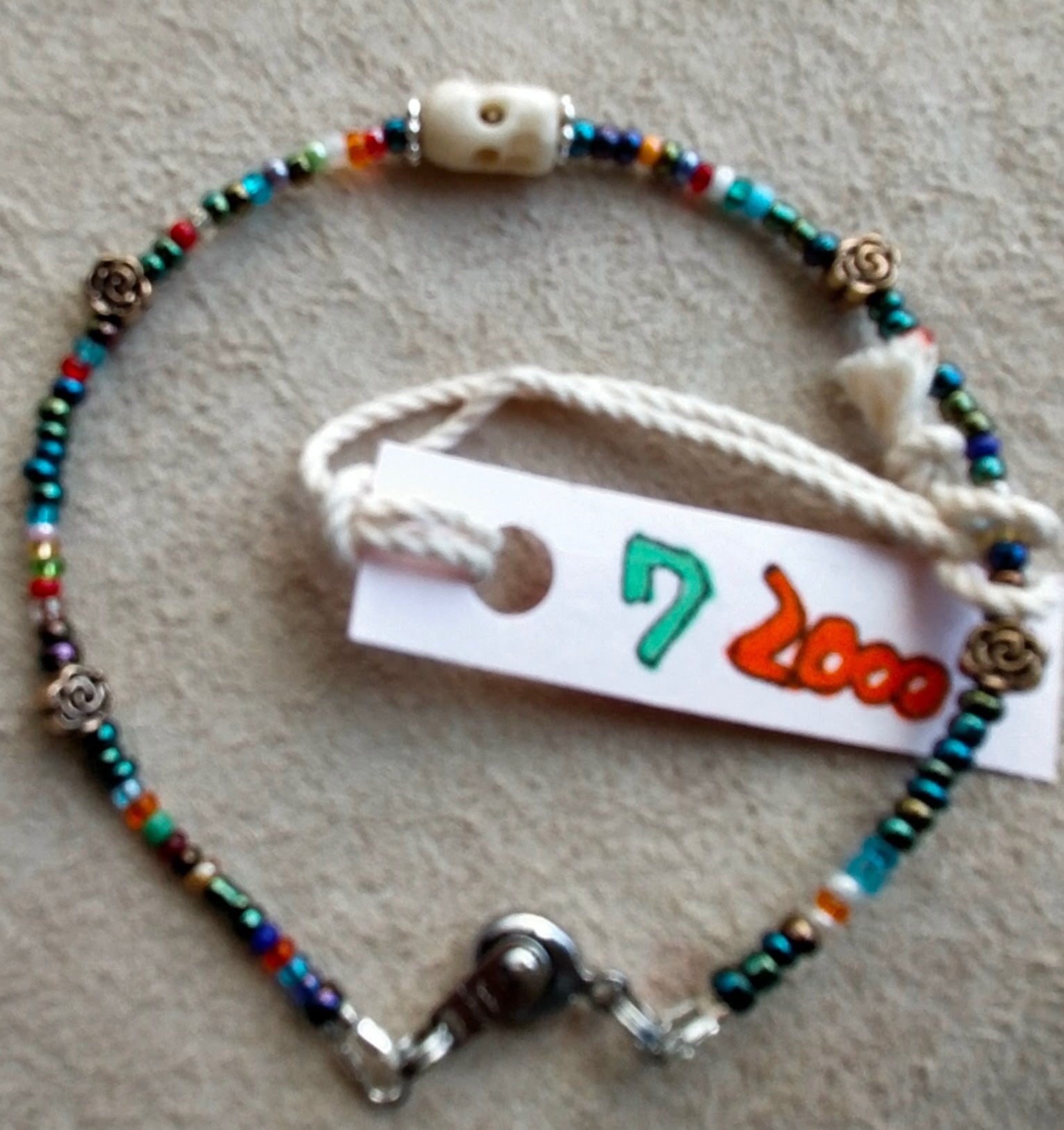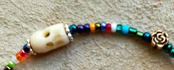 小径カラフルガラスビーズ、中央にボーンスカルメタルの花を使用している ヒッピー世代を思わせる