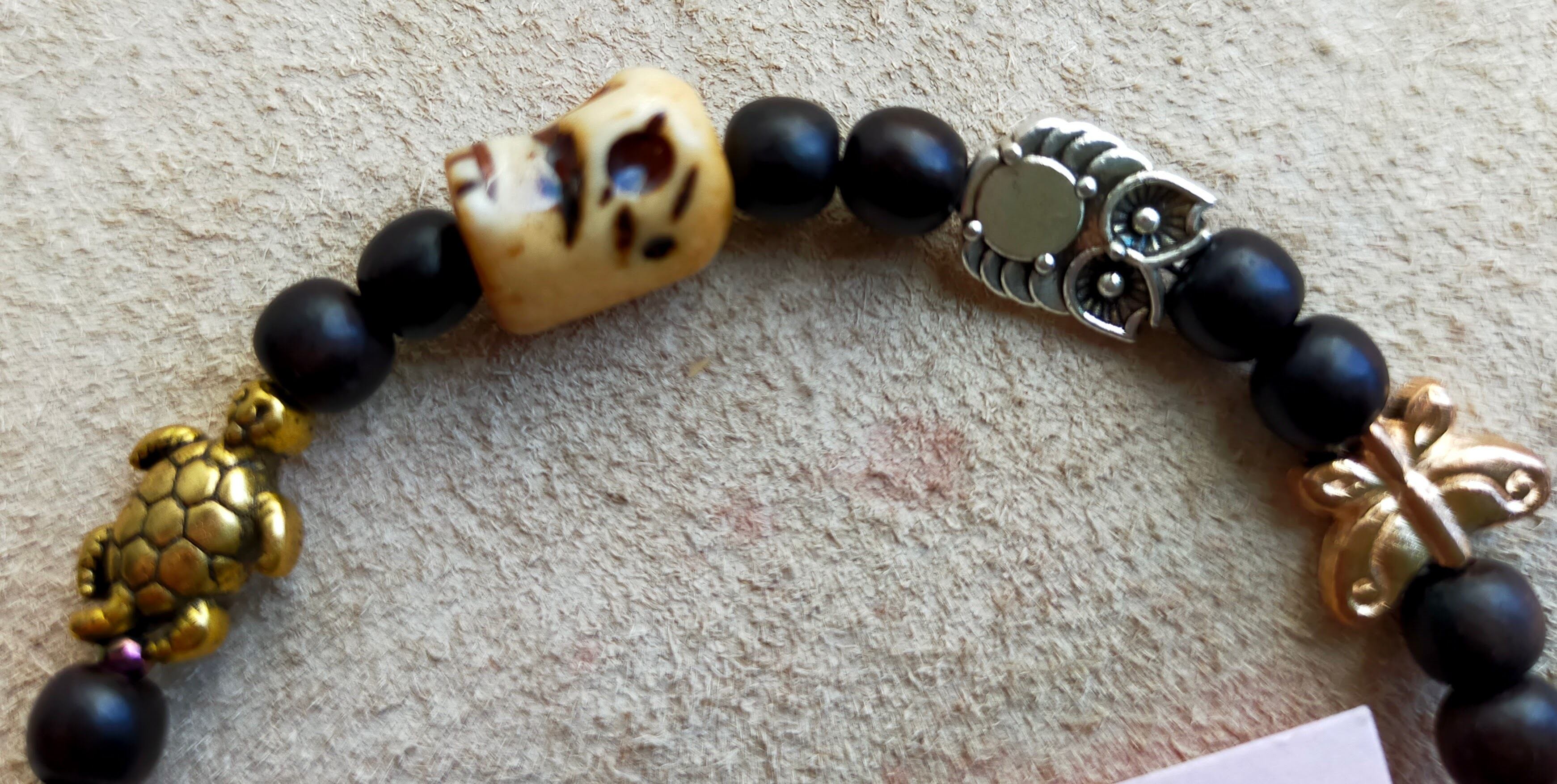 黒檀5ミリ玉に開運ビーズを散りばめたニュースタイルブレスレット ふくろう、蝶、鯛? いずれも開運、招福、グッズ ◆190ミリ