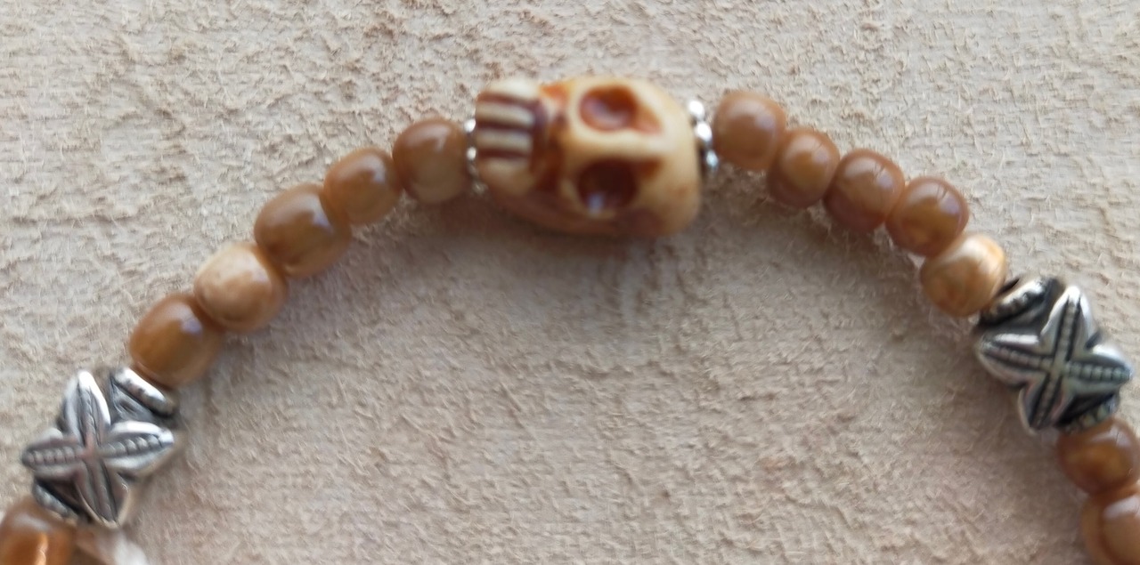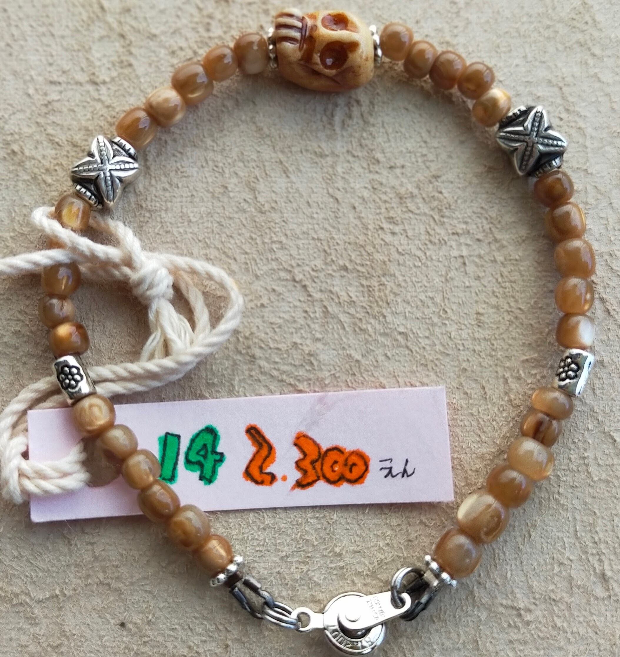 シェルビーズに渋めのメタルビーズにボーンスカルを散りばめた控え目に輝く1品