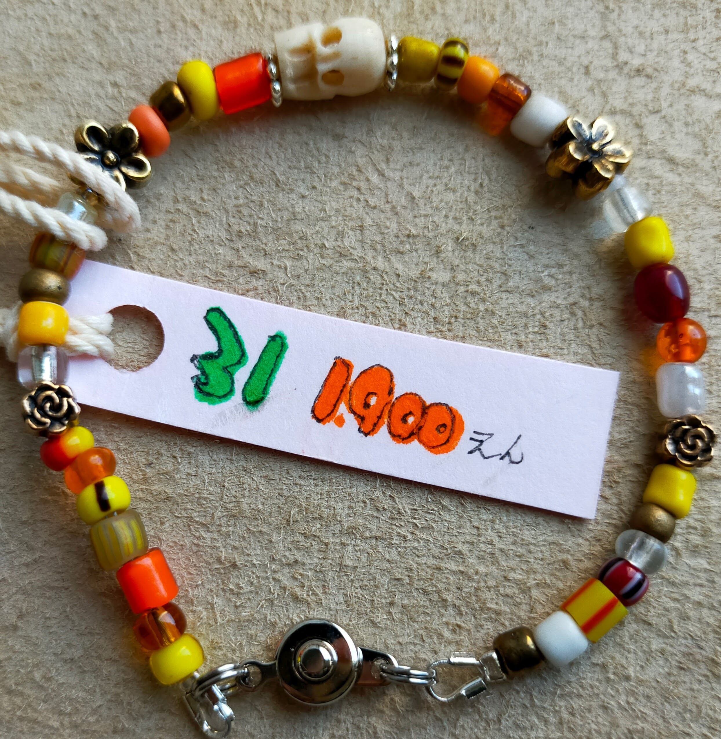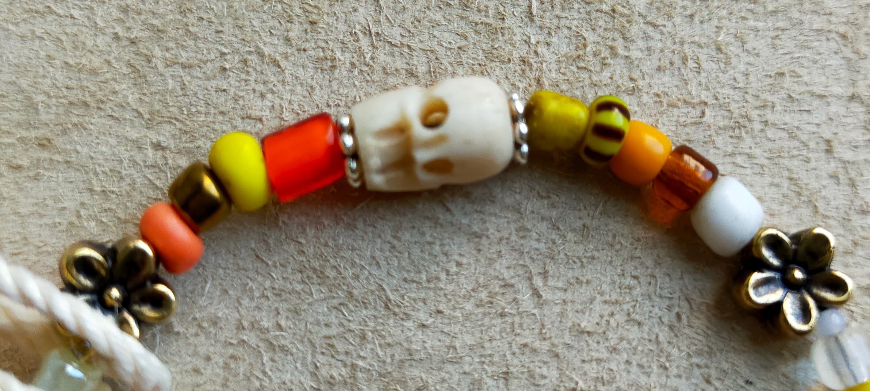 暖色の小径カラフルビーズ・ボーンスカルを1個あしらった、ちょっと渋くて少し派手な仕上がり
