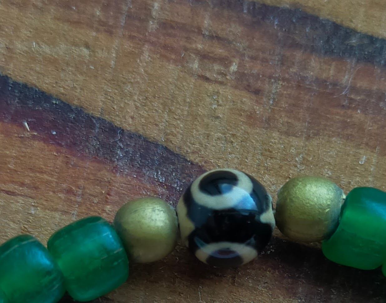 渋いグリーン島もようのジャワビーズにしんちゅう玉:三眼天珠を組み合わせたこちらは店頭販売品を回収した物で、金具等多少アセてたため55%OFFのお値打ち品となります