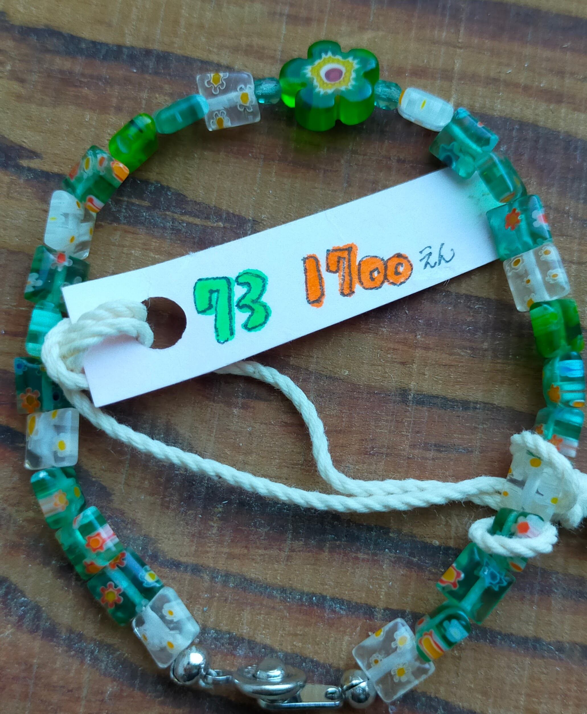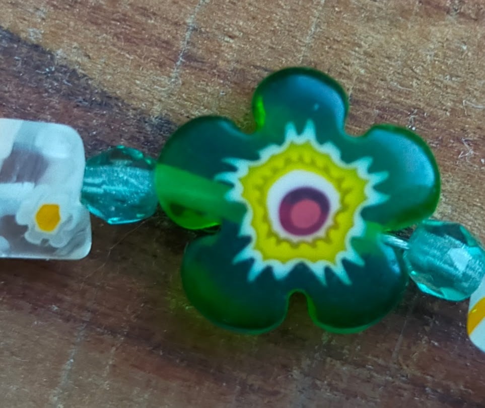 珍しい花模様のアクリルでスクエア形のビーズと存在感のあるヨーロッパ生まれの花ビーズを中心に1個置いたシンプルな1品。いくらか大人の雰囲気の漂う1品、ただし魔除け効果は無。