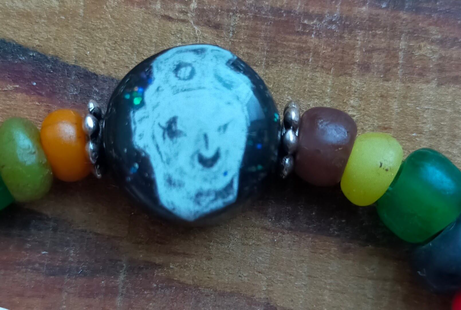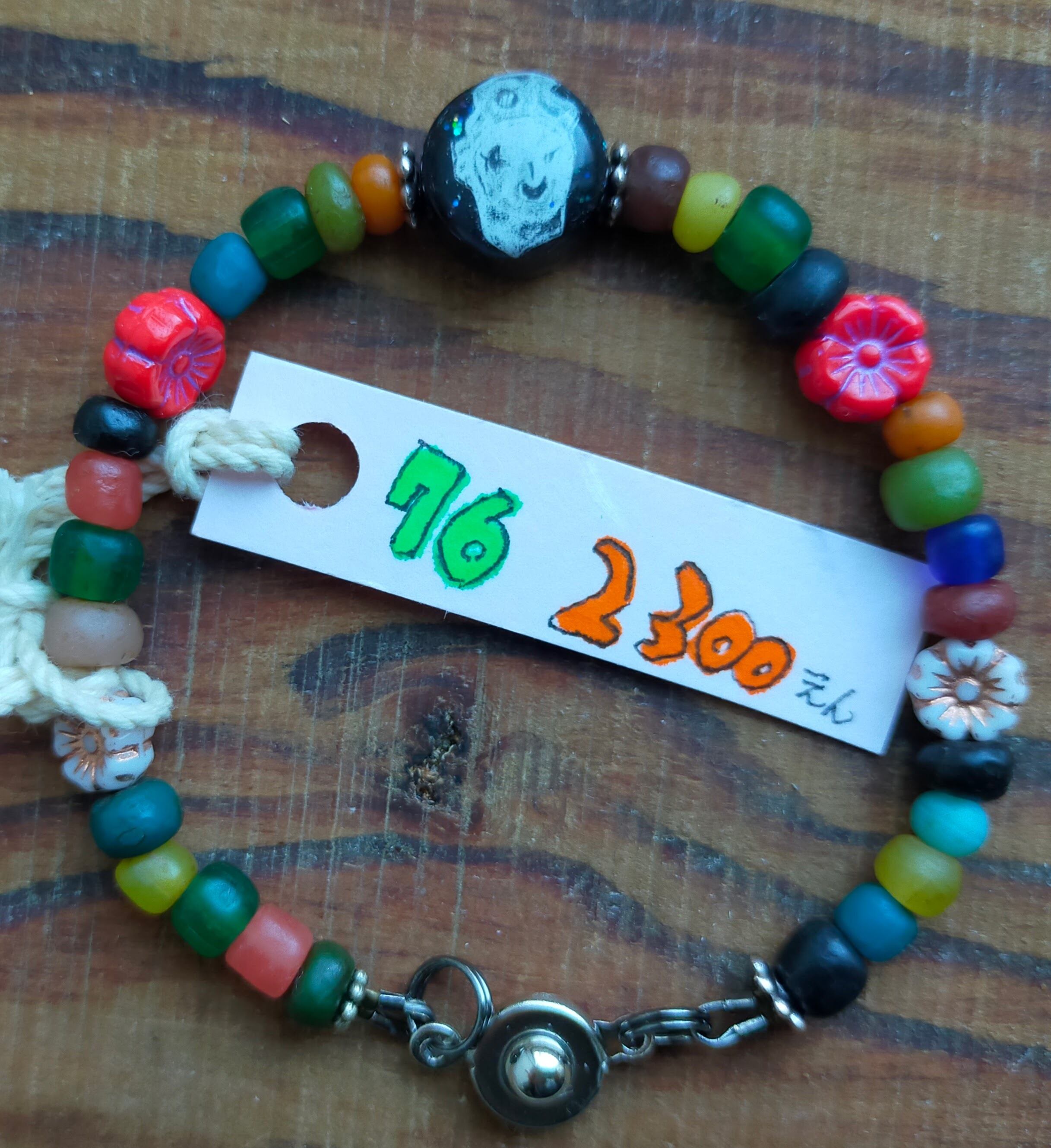 ジャワビーズに花形チェコビーズ、中央には星形の目を持つ人物、五日市線の秋川で発掘されたつばめの