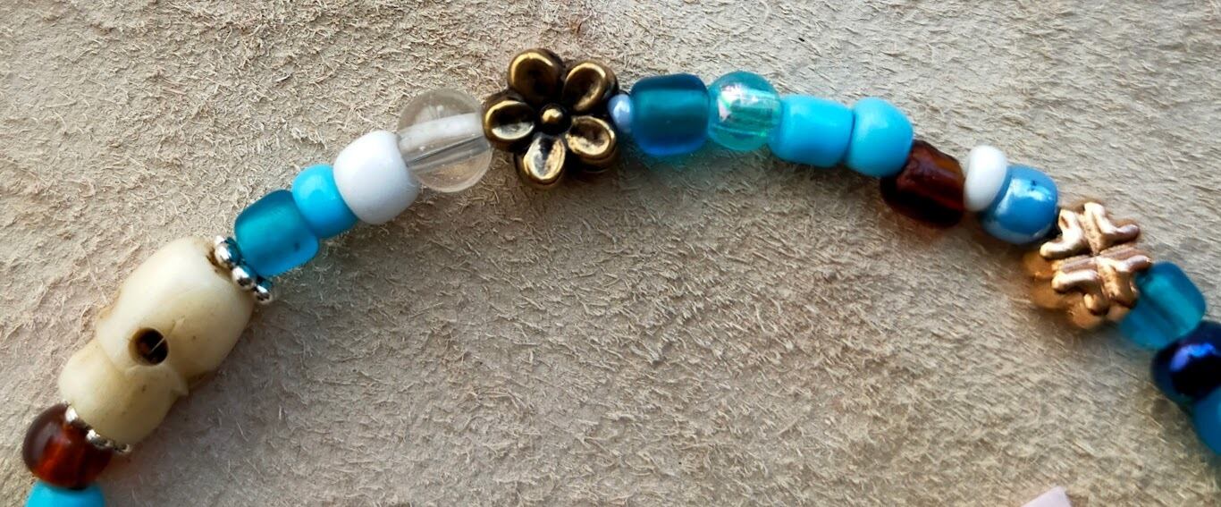 ブルー系の小径カラービーズにボーンスカルを中央に、メタルのフラワービーズを4個散りばめた若々しいブレスレット