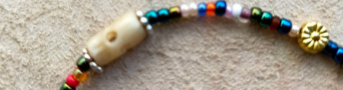 小径カラフルガラスビーズ、中央にボーンスカルメタルの花を使用している ヒッピー世代を思わせる
