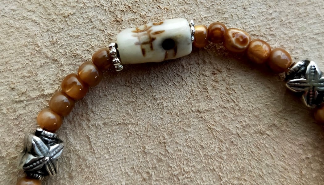 シェルビーズに渋めのメタルビーズにボーンスカルを散りばめた控え目に輝く1品