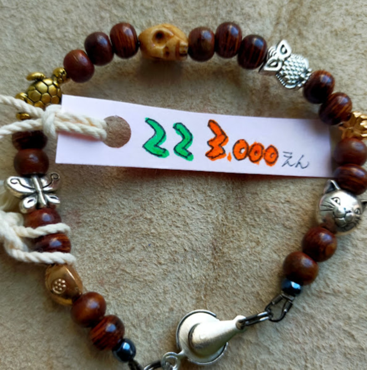 6ミリ玉ウッドビーズにメタルビーズの開運グッズ「ふくろう、猫、てんとう虫、亀」を散りばめ更に手彫りのボーンスカルが中央ににらみを利かせている