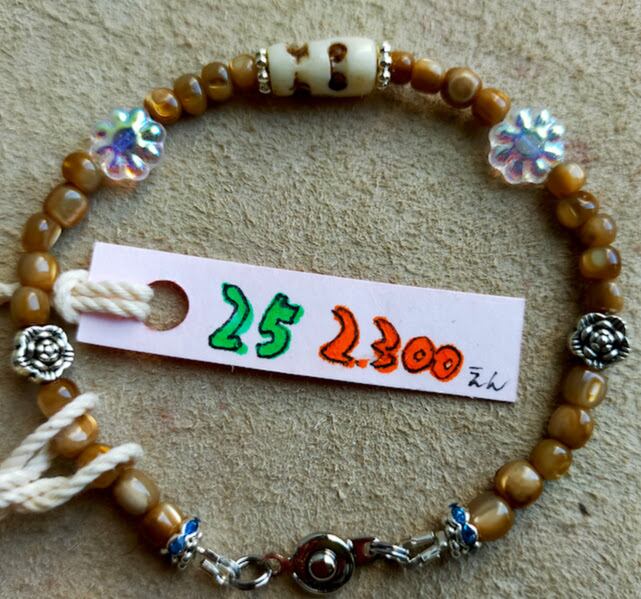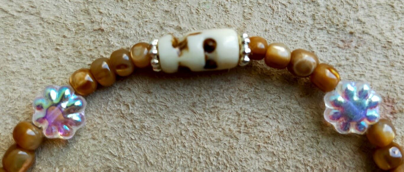 シェルビーズにチェコビーズ、メタルビーズを配し、中央にボーンスカル